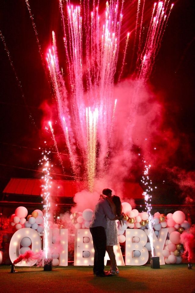 Запуск тяжёлого дыма, запуск конфетти (гендерного цвета), световые приборы.