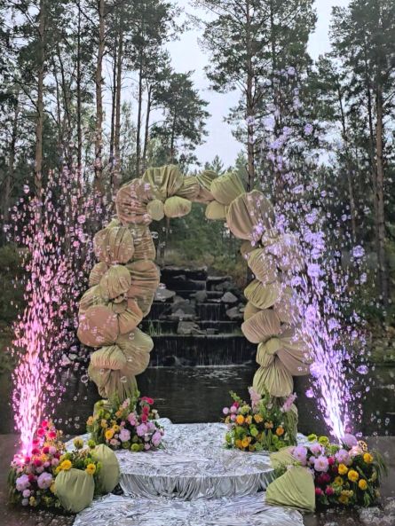 Мы работаем только фонтанами с серебристым цветом искр, что важно для фото и видео сьемки. Фонтаны можно установить на улице дорожкой с двух сторон и запускать дистанционно попарно, или установить полукругом "стеной" и запустить все разом.